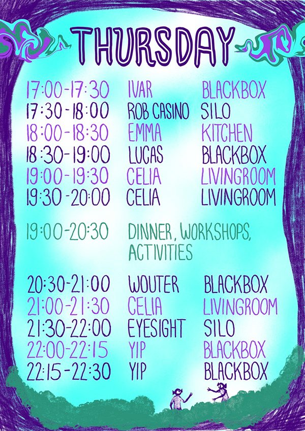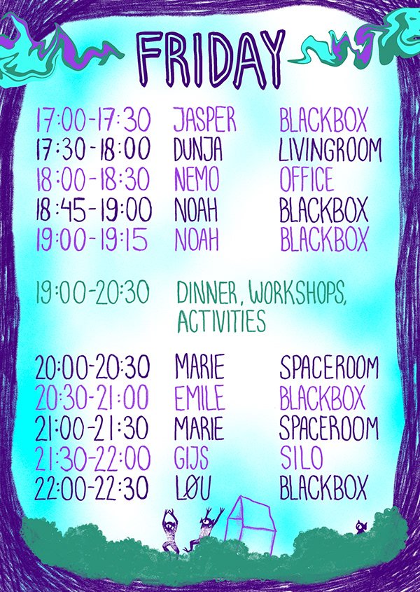 For this festival, I was asked to design a few elements: de time table poster, the site plan, the main poster, and an instagrampost to introduce every artist. Later I made designes for totebags and stickes.